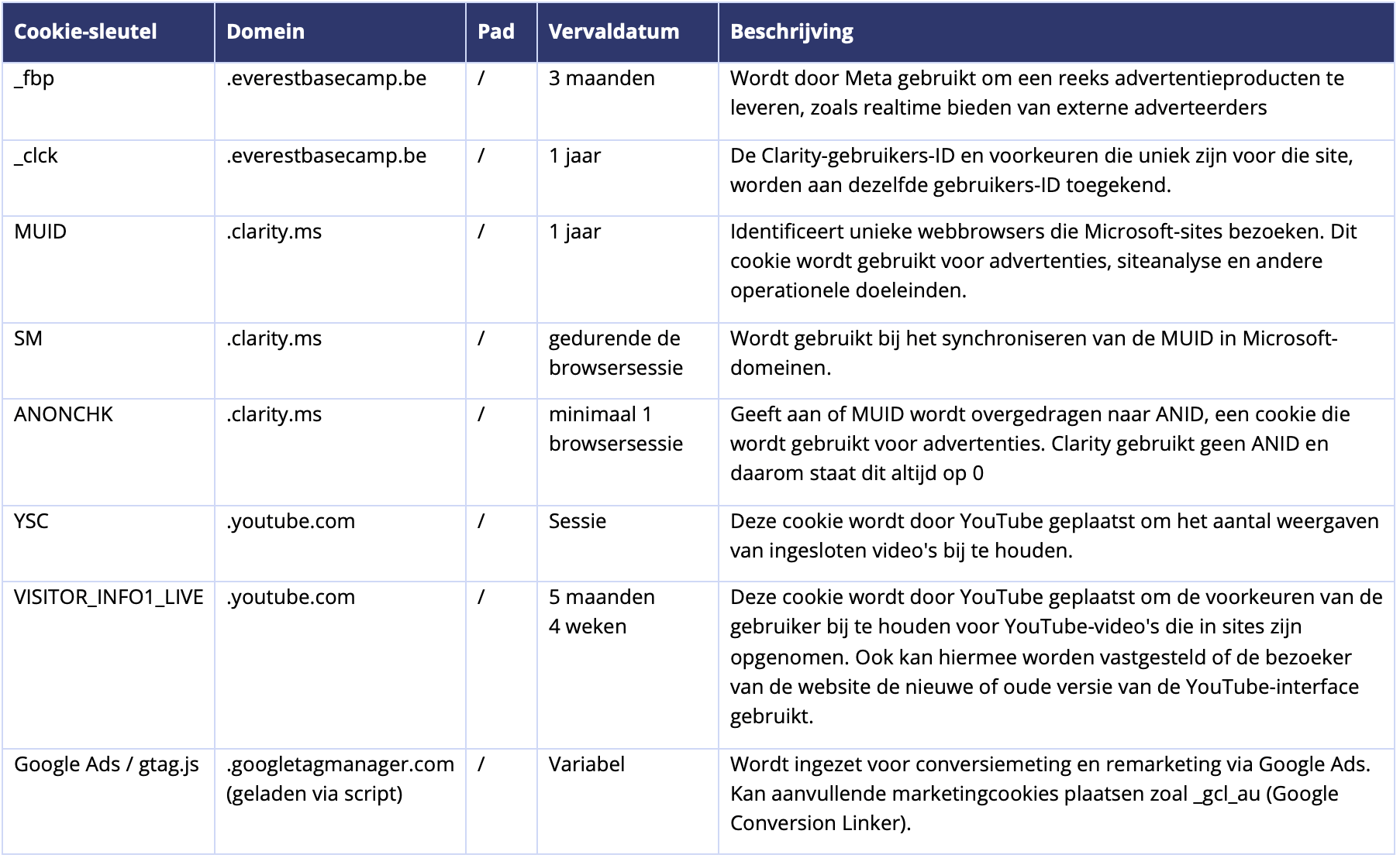 Een cookie is een klein tekstbestandje met gegevens dat een website (wanneer een gebruiker deze bezoekt) op jouw apparaat wil opslaan om zo informatie over jou, zoals je taalvoorkeur te kunnen onthouden. Deze cookies worden door ons ingesteld en heten interne cookies. We gebruiken ook externe of third party cookies maar trachten dit zoveel mogelijk te vermijden. Dit zijn cookies van een ander domein dan de website waarop je je bevindt en ze worden gebruikt voor advertentie- en marketingdoeleinden. Wij gebruiken ze zelf niet in het bijzonder, maar soms plaatsen Meta, Google of YouTube al eens een cookie zonder dat we het zelf willen. In het bijzonder gebruiken we onderstaande lijst van cookies en andere tracking-technologieën voor de volgende doeleinden: